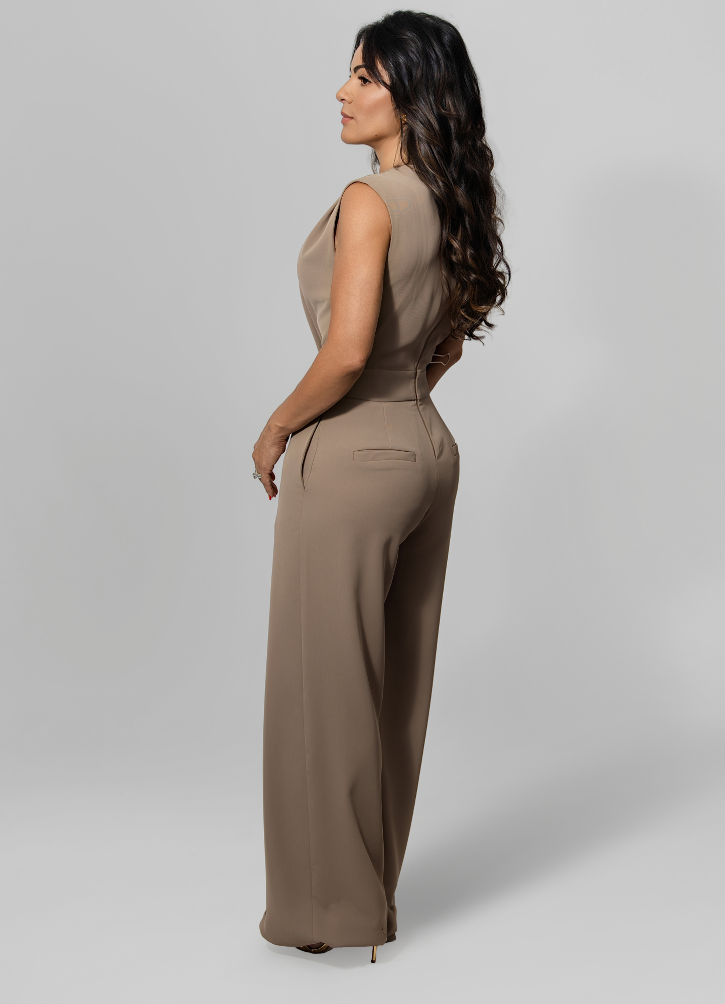 Effortless sophistication meets modern tailoring in this wide-leg jumpsuit. Designed in a soft, neutral taupe tone, it features a sleek sleeveless bodice with subtle shoulder draping, creating a refined silhouette. The waist is accentuated by a gold chic tortoiseshell-effect buckle, enhancing the tailored fit and elongating the figure.