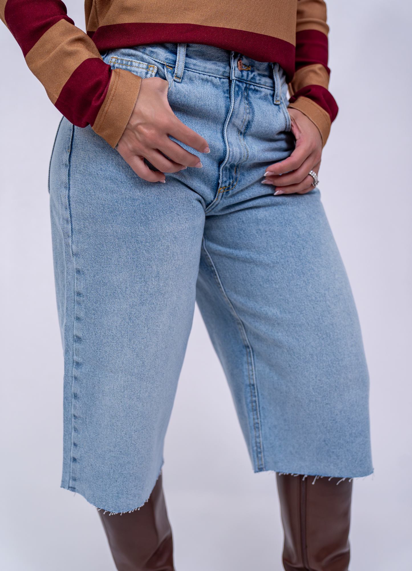 Timeless and versatile, this light wash denim Bermuda brings a modern twist to casual dressing. designed with a relaxed, slightly wide-leg cut, it combines comfort and style for an effortlessly chic look. The raw cut hem adds an edgy, contemporary finish, making it the perfect piece to dress up or down. Straight, relaxed cut that falls just below the knee.